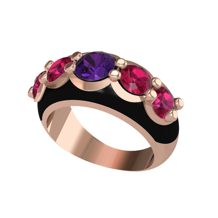 Ametist ve rodolit garnet 925 ayar rose altın kaplama gümüş yüzük (Siyah mineli)