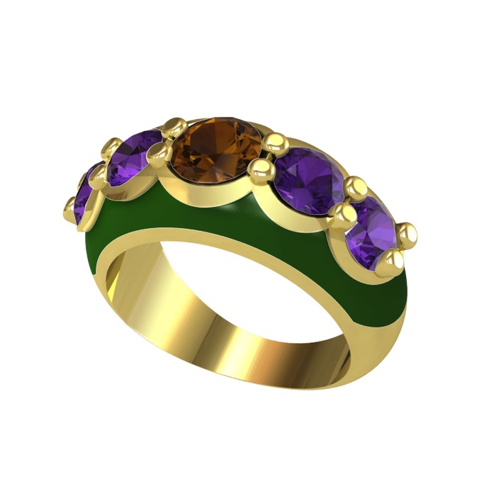 Dumanlı kuvars ve ametist 925 ayar altın kaplama gümüş yüzük (Yeşil mineli)