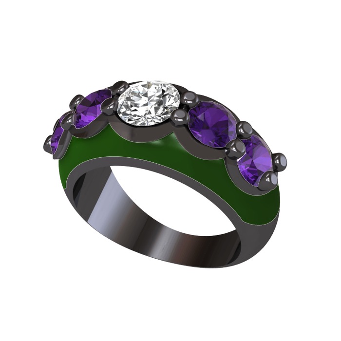 Elmas ve ametist 925 ayar siyah rodyum kaplama gümüş yüzük (0.68 karat, yeşil mineli)