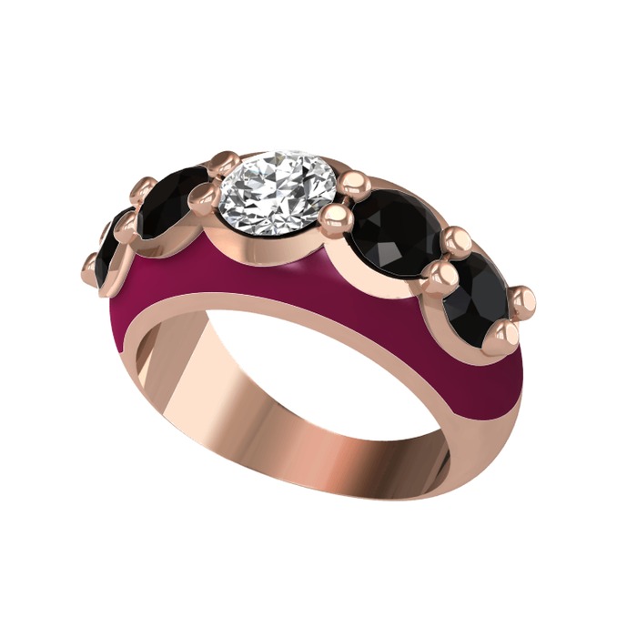 Elmas ve siyah zirkon 18 ayar rose altın yüzük (0.68 karat, bordo kırmızı mineli)