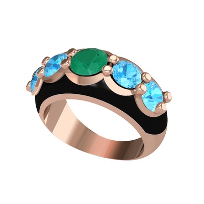Kök zümrüt ve akuamarin 14 ayar rose altın yüzük (Siyah mineli)