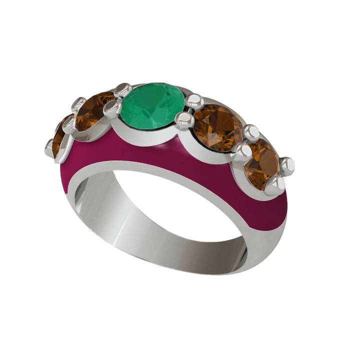 Kök zümrüt ve dumanlı kuvars 18 ayar beyaz altın yüzük (Bordo kırmızı mineli)