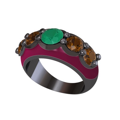 Kök zümrüt ve dumanlı kuvars 925 ayar siyah rodyum kaplama gümüş yüzük (Bordo kırmızı mineli)