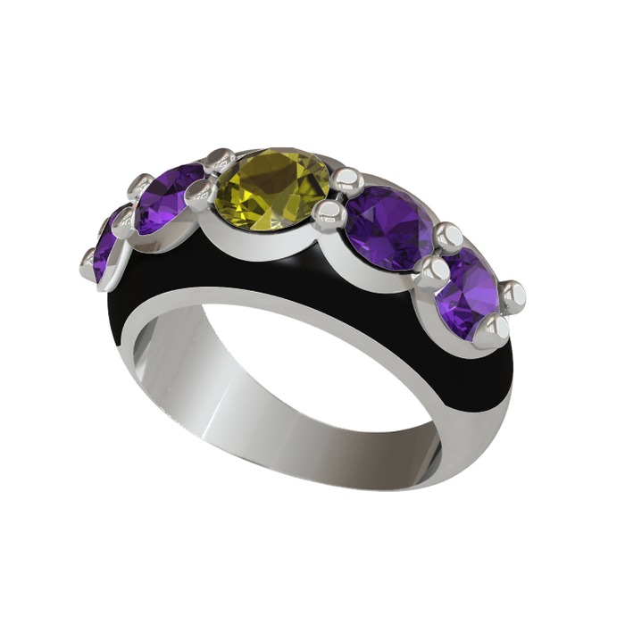 Peridot ve ametist 18 ayar beyaz altın yüzük (Siyah mineli)
