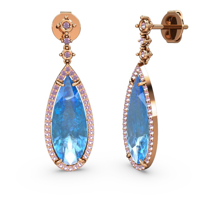 Akuamarin ve pembe kuvars 14 ayar rose altın küpe