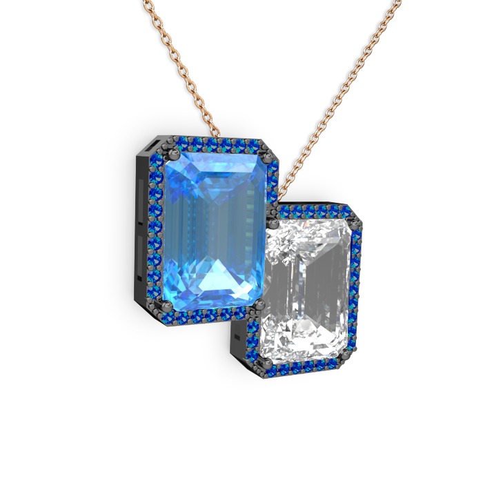 Akuamarin, beyaz zirkon ve lab safir 925 ayar siyah rodyum kaplama gümüş kolye (40 cm rose altın rolo zincir)