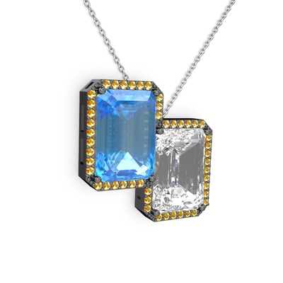 Akuamarin, beyaz zirkon ve sitrin 925 ayar siyah rodyum kaplama gümüş kolye (40 cm beyaz altın rolo zincir)