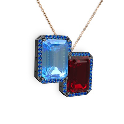 Akuamarin, garnet ve lab safir 925 ayar siyah rodyum kaplama gümüş kolye (40 cm rose altın rolo zincir)