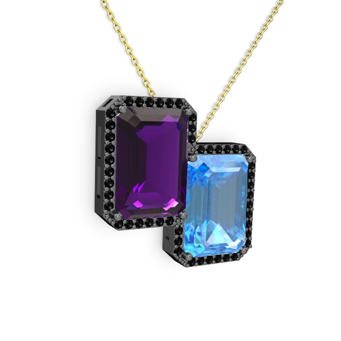 Ametist, akuamarin ve siyah zirkon 925 ayar siyah rodyum kaplama gümüş kolye (40 cm altın rolo zincir)