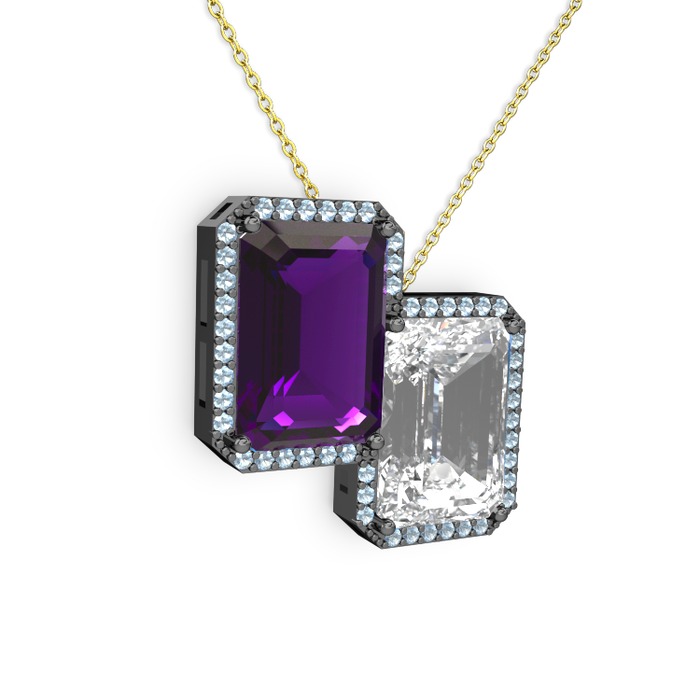 Ametist, beyaz zirkon ve akuamarin 925 ayar siyah rodyum kaplama gümüş kolye (40 cm altın rolo zincir)