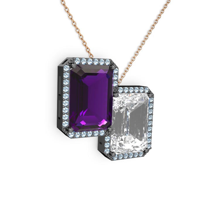 Ametist, beyaz zirkon ve akuamarin 925 ayar siyah rodyum kaplama gümüş kolye (40 cm rose altın rolo zincir)