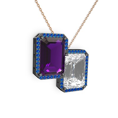 Ametist, beyaz zirkon ve lab safir 925 ayar siyah rodyum kaplama gümüş kolye (40 cm rose altın rolo zincir)