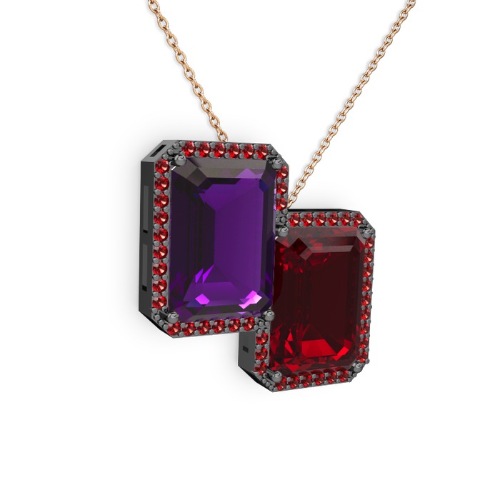 Ametist ve garnet 925 ayar siyah rodyum kaplama gümüş kolye (40 cm rose altın rolo zincir)
