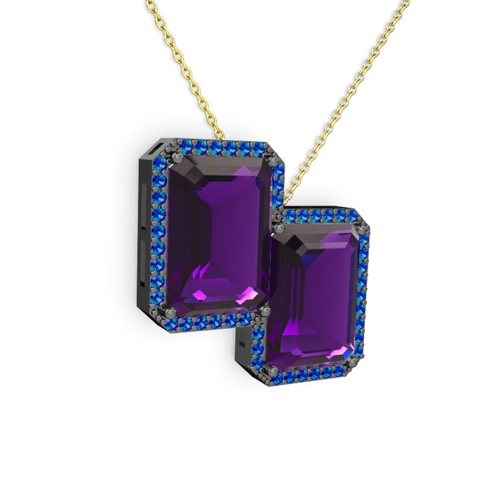 Ametist ve lab safir 925 ayar siyah rodyum kaplama gümüş kolye (40 cm altın rolo zincir)