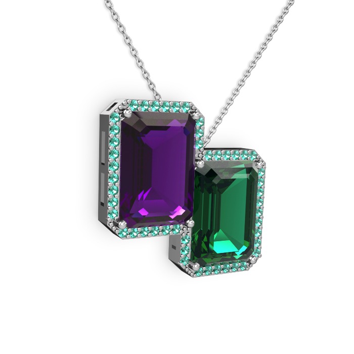 Ametist ve yeşil kuvars 14 ayar beyaz altın kolye (40 cm beyaz altın rolo zincir)