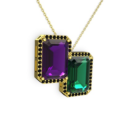 Ametist, yeşil kuvars ve siyah zirkon 18 ayar altın kolye (40 cm gümüş rolo zincir)
