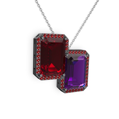 Garnet ve ametist 925 ayar siyah rodyum kaplama gümüş kolye (40 cm beyaz altın rolo zincir)