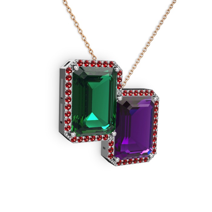 Yeşil kuvars, ametist ve garnet 14 ayar beyaz altın kolye (40 cm rose altın rolo zincir)