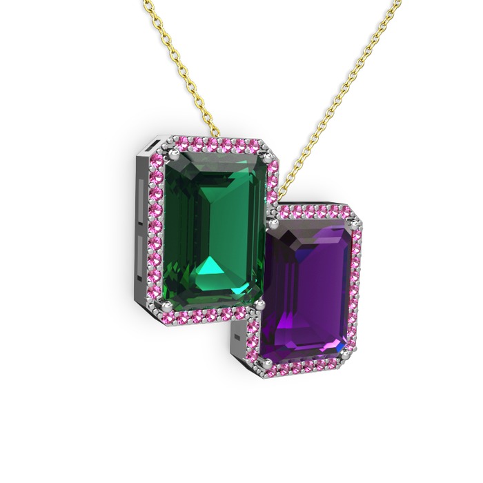 Yeşil kuvars, ametist ve rodolit garnet 14 ayar beyaz altın kolye (40 cm gümüş rolo zincir)