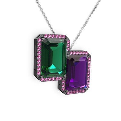 Yeşil kuvars, ametist ve rodolit garnet 925 ayar siyah rodyum kaplama gümüş kolye (40 cm beyaz altın rolo zincir)