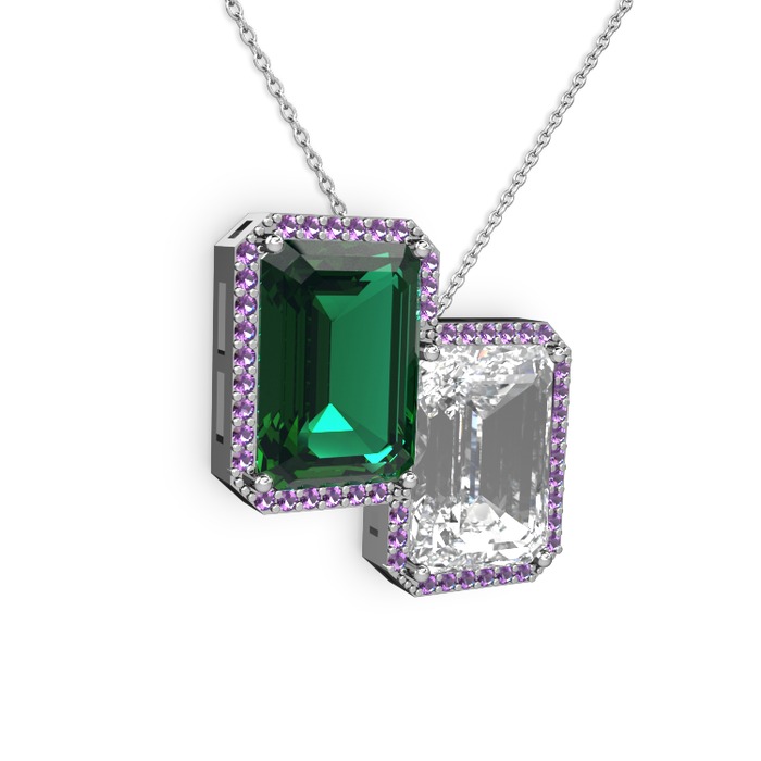Yeşil kuvars, beyaz zirkon ve ametist 8 ayar beyaz altın kolye (40 cm beyaz altın rolo zincir)