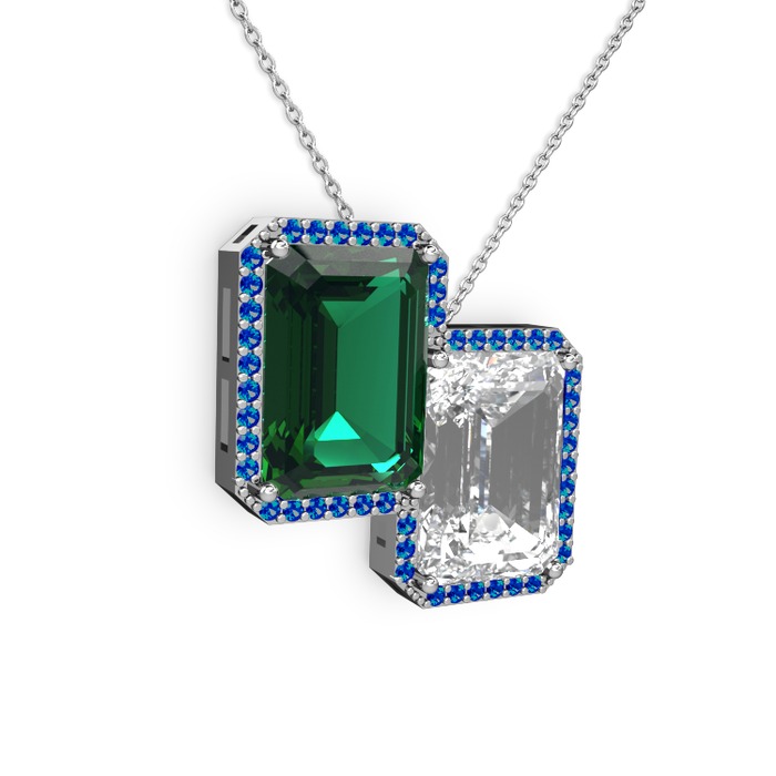 Yeşil kuvars, beyaz zirkon ve lab safir 14 ayar beyaz altın kolye (40 cm beyaz altın rolo zincir)