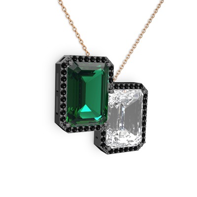 Yeşil kuvars, beyaz zirkon ve siyah zirkon 925 ayar siyah rodyum kaplama gümüş kolye (40 cm rose altın rolo zincir)
