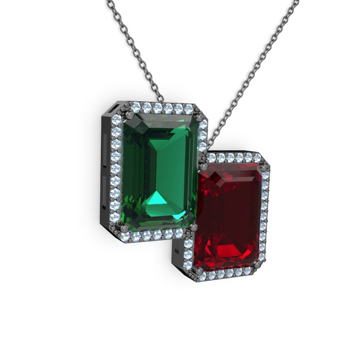 Yeşil kuvars, garnet ve akuamarin 925 ayar siyah rodyum kaplama gümüş kolye (40 cm gümüş rolo zincir)
