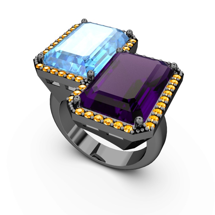 Akuamarin, ametist ve sitrin 925 ayar siyah rodyum kaplama gümüş yüzük