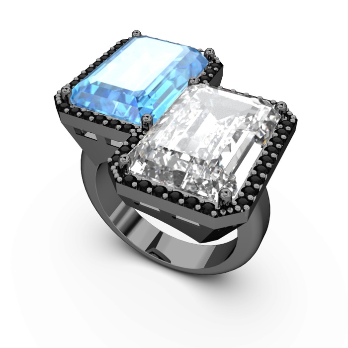 Akuamarin, beyaz zirkon ve siyah zirkon 925 ayar siyah rodyum kaplama gümüş yüzük