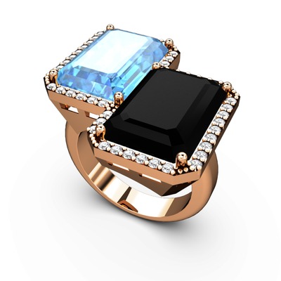 Akuamarin, siyah zirkon ve swarovski 8 ayar rose altın yüzük