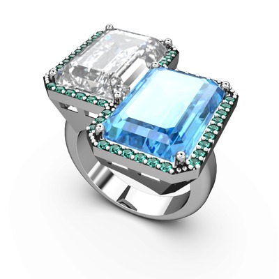 Beyaz zirkon, akuamarin ve yeşil kuvars 8 ayar beyaz altın yüzük