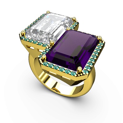 Beyaz zirkon, ametist ve yeşil kuvars 925 ayar altın kaplama gümüş yüzük