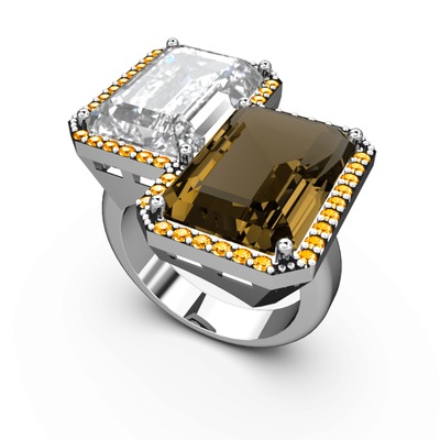 Beyaz zirkon, dumanlı kuvars ve sitrin 14 ayar beyaz altın yüzük