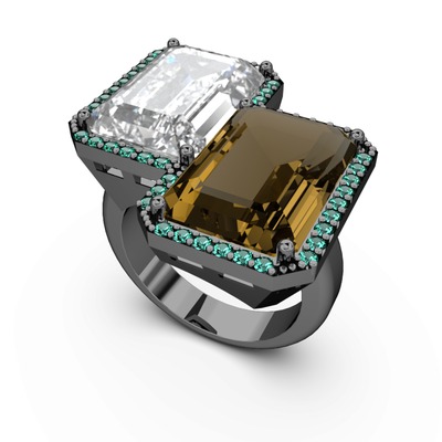 Beyaz zirkon, dumanlı kuvars ve yeşil kuvars 925 ayar siyah rodyum kaplama gümüş yüzük