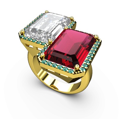 Beyaz zirkon, rodolit garnet ve yeşil kuvars 14 ayar altın yüzük