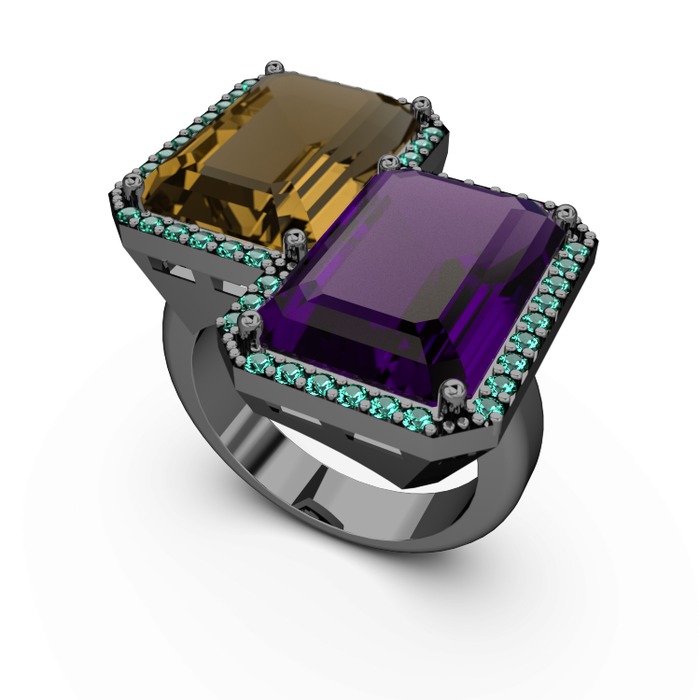 Dumanlı kuvars, ametist ve yeşil kuvars 925 ayar siyah rodyum kaplama gümüş yüzük