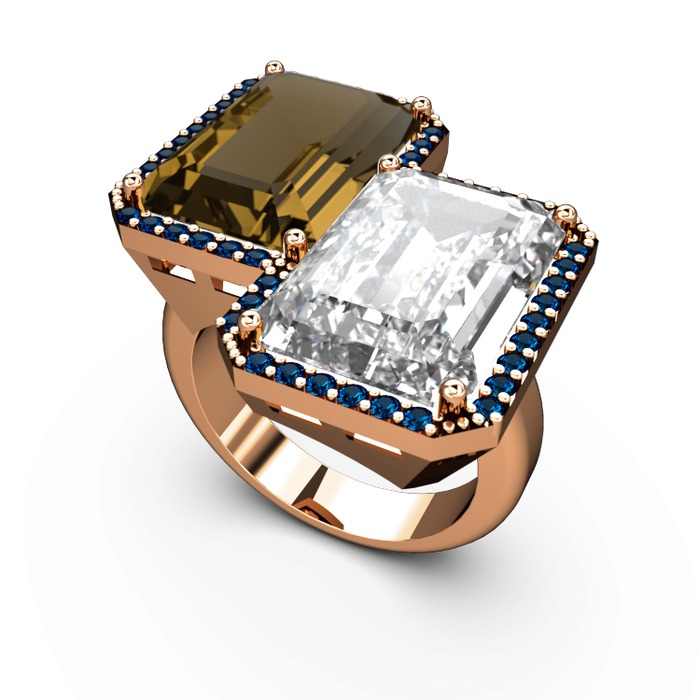 Dumanlı kuvars, beyaz zirkon ve lab safir 14 ayar rose altın yüzük