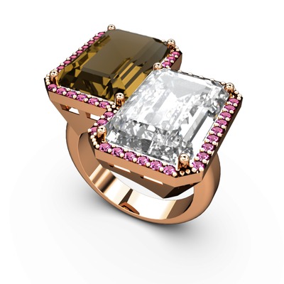 Dumanlı kuvars, beyaz zirkon ve rodolit garnet 8 ayar rose altın yüzük