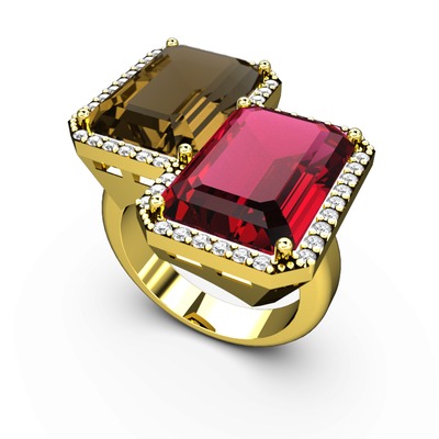 Dumanlı kuvars, rodolit garnet ve swarovski 14 ayar altın yüzük