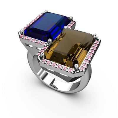 Lab safir, dumanlı kuvars ve pembe kuvars 14 ayar beyaz altın yüzük