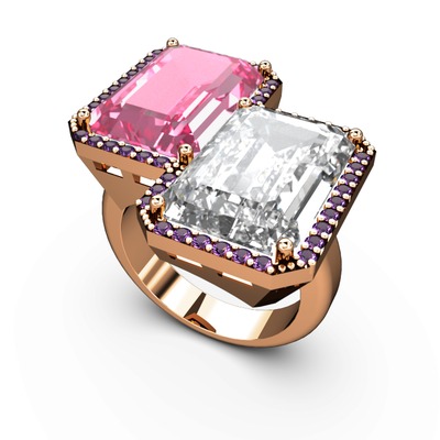 Pembe kuvars, beyaz zirkon ve ametist 925 ayar rose altın kaplama gümüş yüzük