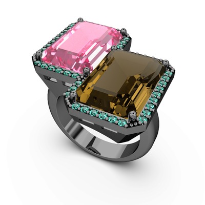 Pembe kuvars, dumanlı kuvars ve yeşil kuvars 925 ayar siyah rodyum kaplama gümüş yüzük