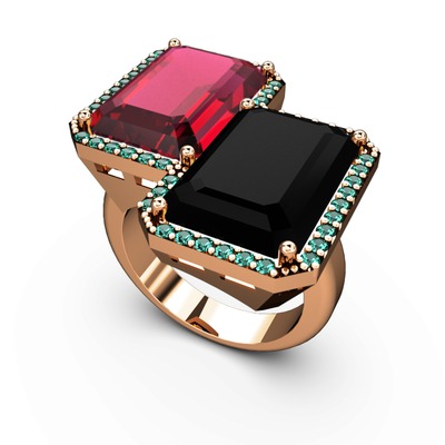 Rodolit garnet, siyah zirkon ve yeşil kuvars 8 ayar rose altın yüzük