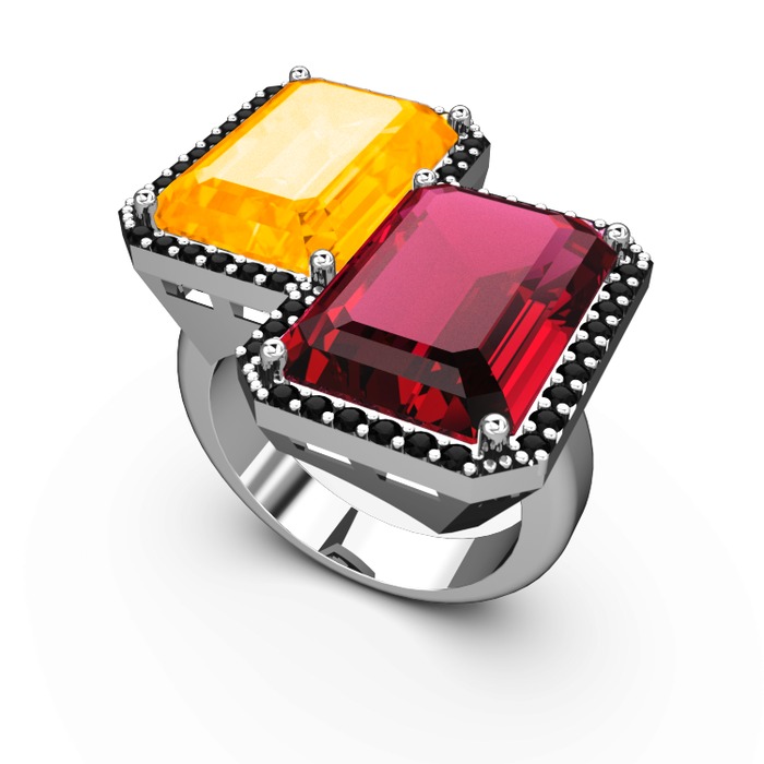 Sitrin, rodolit garnet ve siyah zirkon 18 ayar beyaz altın yüzük