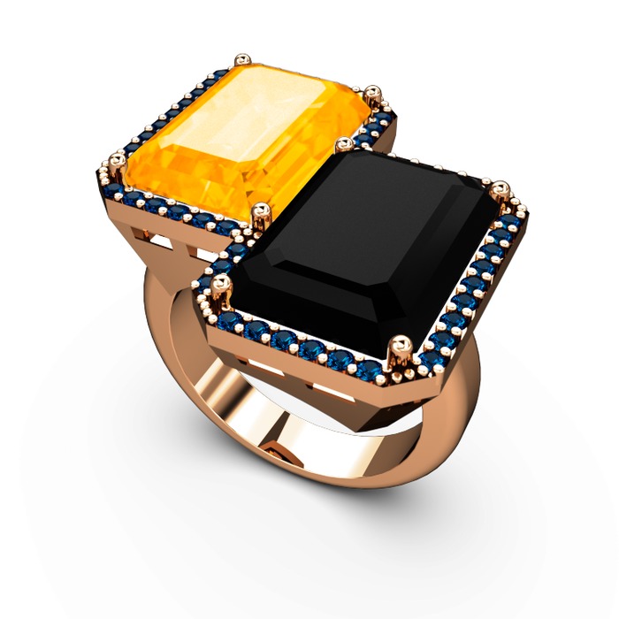 Sitrin, siyah zirkon ve lab safir 14 ayar rose altın yüzük
