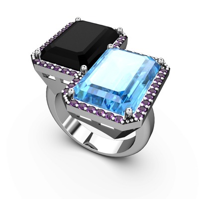 Siyah zirkon, akuamarin ve ametist 8 ayar beyaz altın yüzük