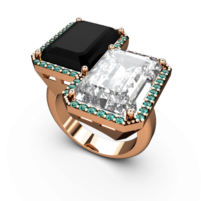 Siyah zirkon, beyaz zirkon ve yeşil kuvars 14 ayar rose altın yüzük
