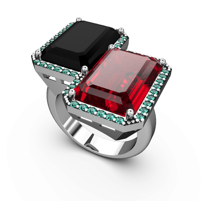 Siyah zirkon, garnet ve yeşil kuvars 18 ayar beyaz altın yüzük