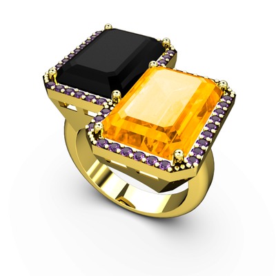 Siyah zirkon, sitrin ve ametist 925 ayar altın kaplama gümüş yüzük